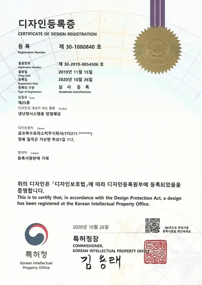 | 2020. 10 | 디자인등록 (냉난방시스템용 방열패널, 30-1080840) | |