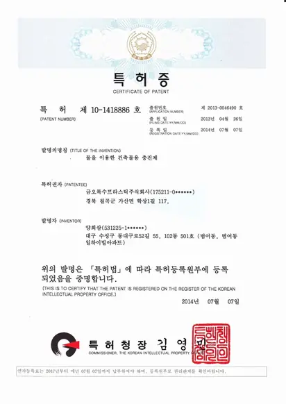 | 2014. 07 | 특허취득 (물을 이용한 건축물 충진제, 10-1418886) | |